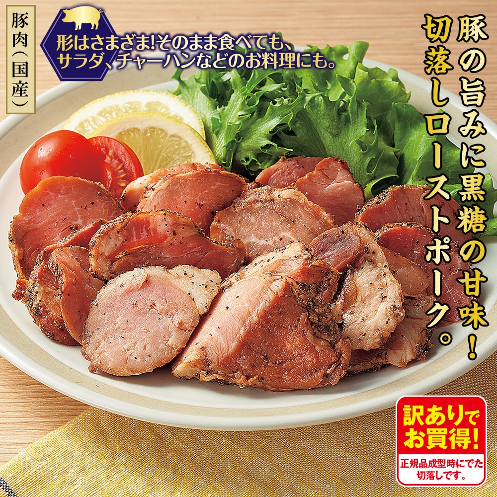 【豚肉(国産)】 形はさまざま! そのまま食べても、サラダ、チャーハンなどのお料理にも。 国産の豚もも肉を醤油ベースの秘伝のたれに漬け込み、さらに黒糖と黒胡椒を刷り込みじっくり焼き上げました。 訳ありでお買得! 正規品成型時にでた切落しです。