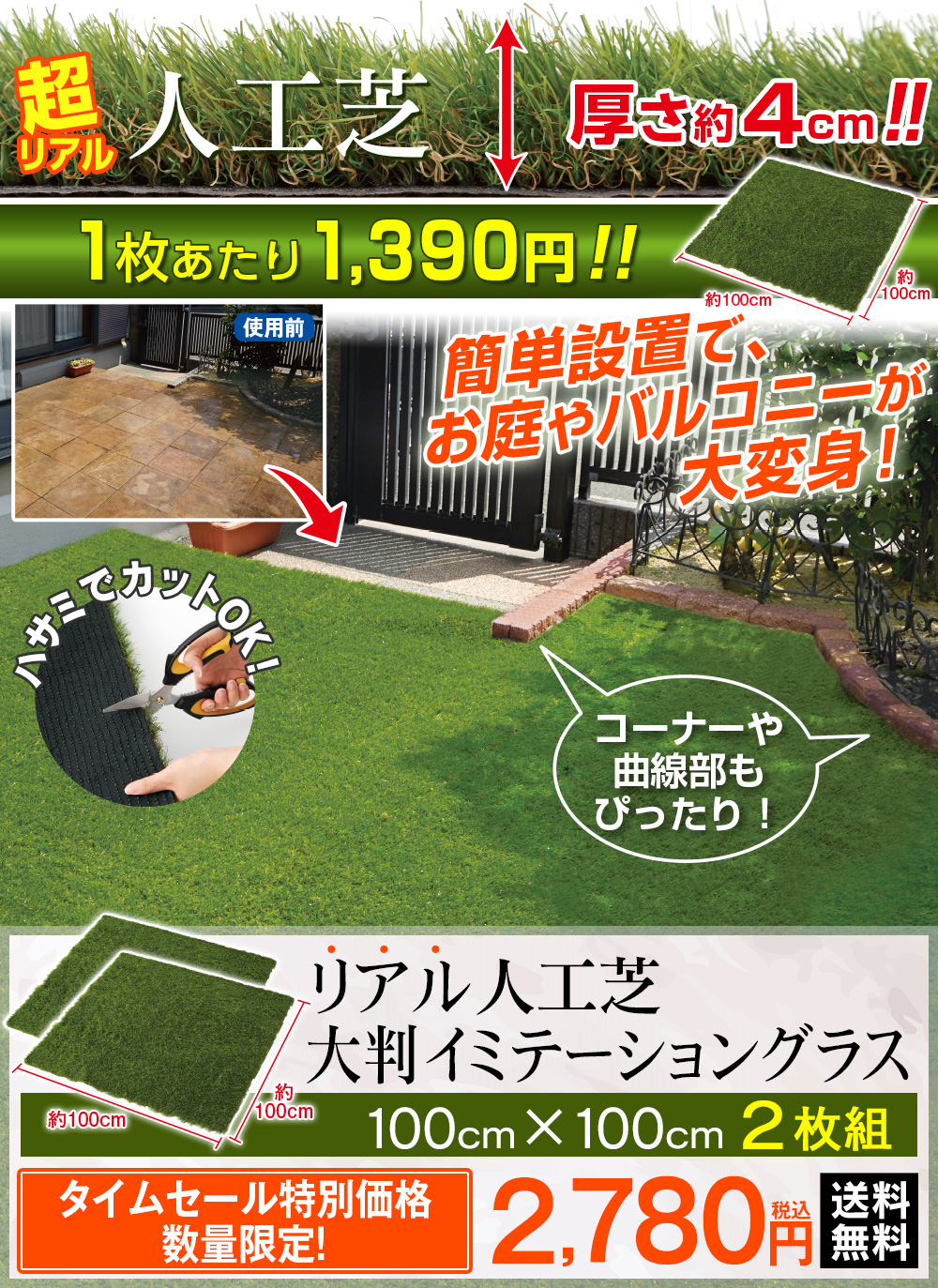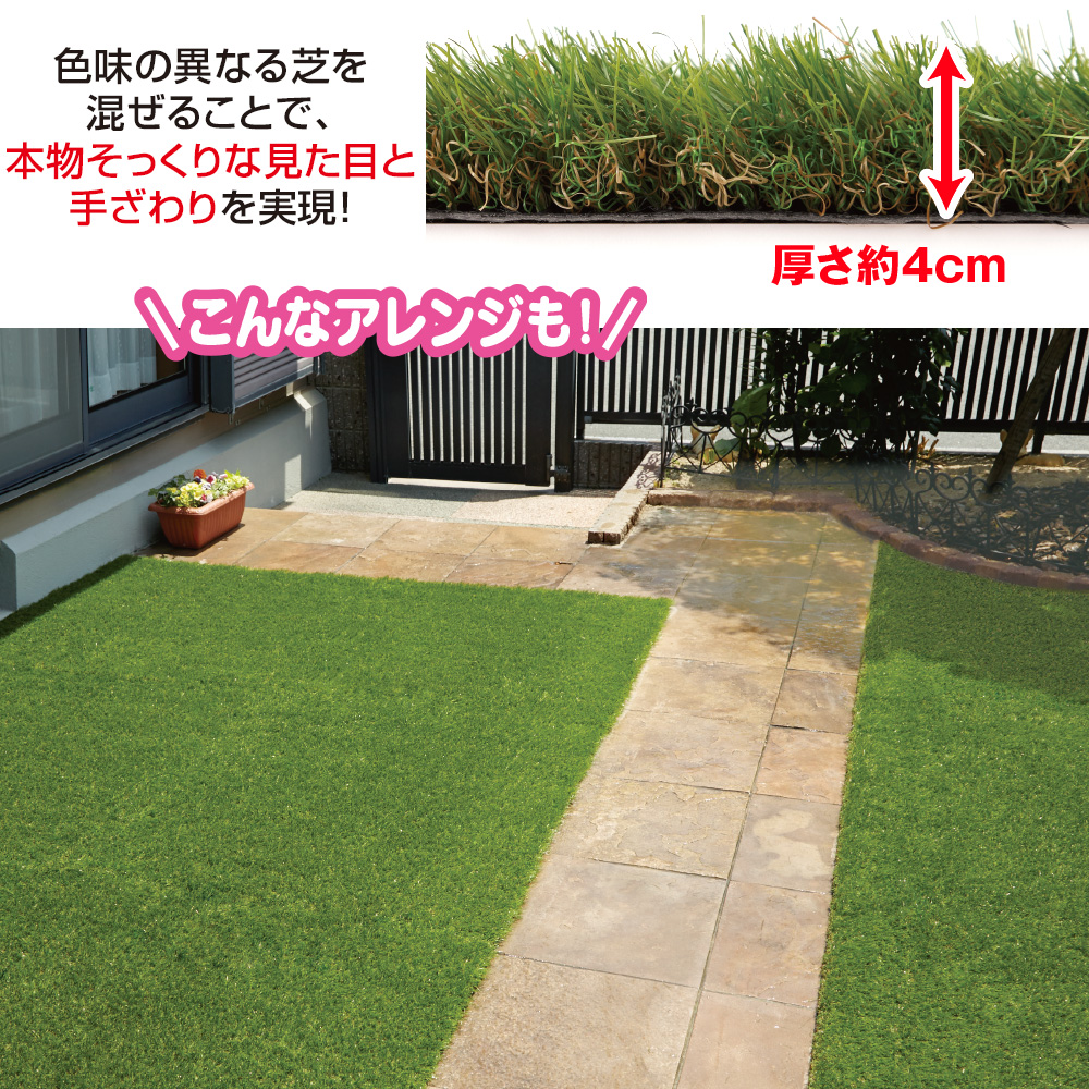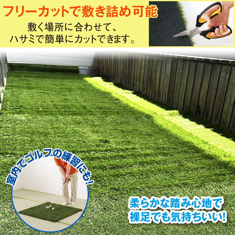 コーナーや曲線部もぴったり!フリーカットで敷きつめ可能。 敷く場所に合わせてハサミでカットできます。 色味の異なる芝を混ぜることで、本物そっくりな見た目と手触りになっています。 柔らかな踏み心地で裸足でも気持ちいい! ・玄関に・ベランダに・ゴルフの練習に